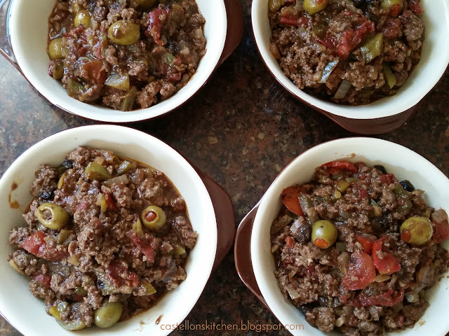 Saute the onion and bell pepper in olive oil in a large skillet until onions are soft about 5 minutes, then add the garlic and ground beef. Mix all ingredients together as the ground beef browns. Add tomatoes, cumin, oregano, and bay leaf, cover and simmer for about 15 minutes or longer. Add olives and raisins and simmer for an additional 5 minutes. Divide picadillo mixture into four individual casserole dishes and prepare masa dough.